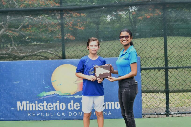 Adelina Pimentel, de Fedotenis, premia a Miguel Baquero, campeón de sencillos de la Copa Maíz U14.