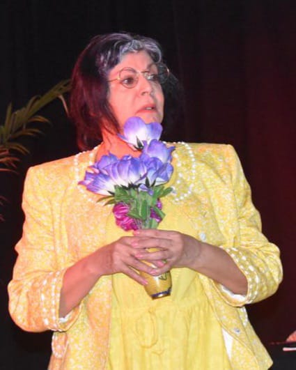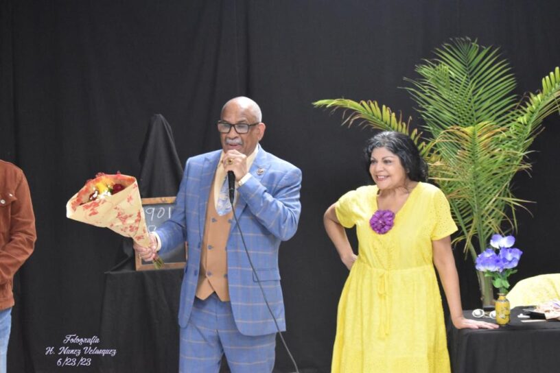 Héctor –Maquiavelo- García entrega flores a la actriz Olga Camil luego de finalizar la presentación del monólogo dedicado a la insigne maestra Ercilia Pepín y a quien agradeció interpretar la obra de su autoría.