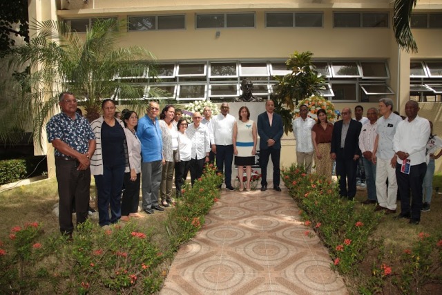 Autoridades de la UASD, familiares y amigos durante el depósito de la ofrenda floral en el busto del extinto académico Roberto Duverge al cumplirse 34 años de su partida física, en la Facultad de Humanidades.