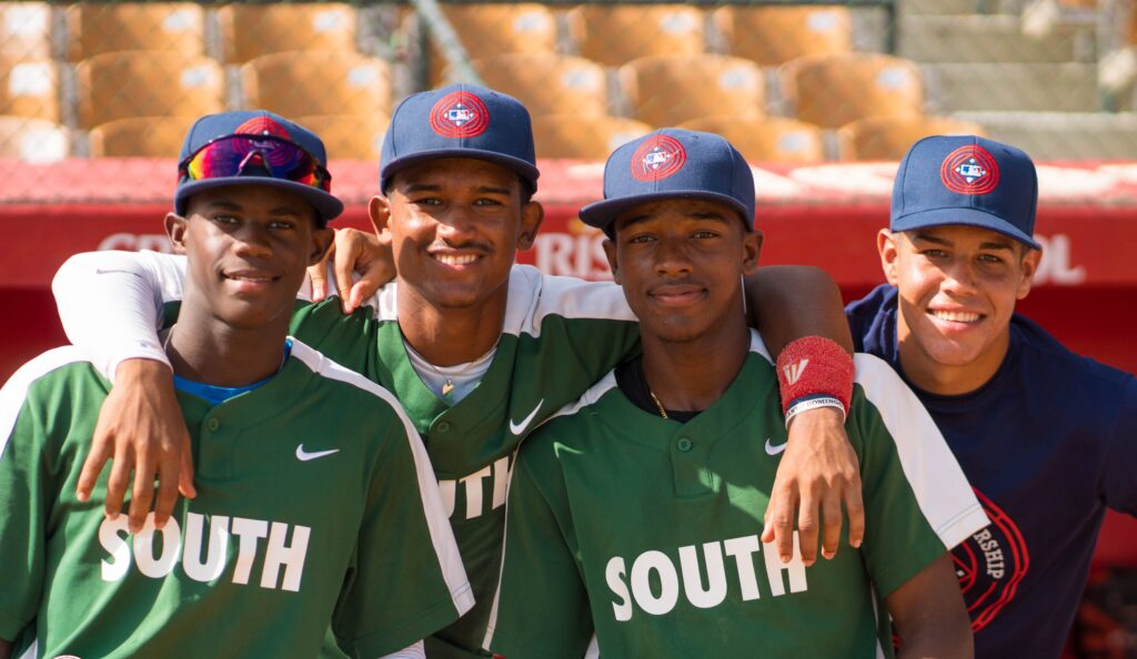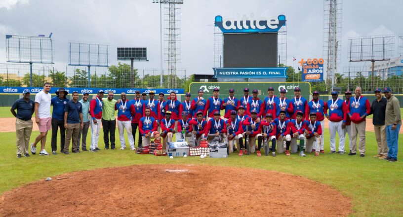 Jugadores de South Green, equipo campeón del torneo Amateur Scouting League, junto al expelotero Dellin Betances y directivos de la Oficina de MLB en República Dominicana.