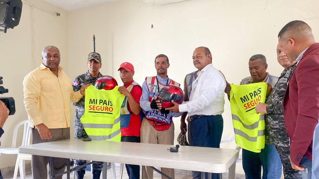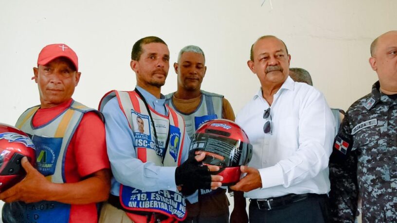 San Cristóbal, RD. – El Ministerio de Interior y Policía entregó cascos protectores y chalecos reflectores a motoconchistas y los orientó sobre el respeto a la ley 63-37, de Tránsito, para que contribuyan con la reducción de los accidentes que presenta la provincia.