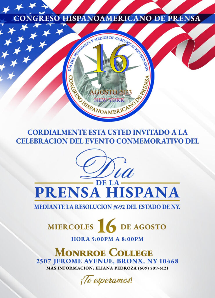 Con gran ceremonia de reconocimiento, magno evento de diversas actividades con un gran programa académico y cultural que organiza el Congreso Hispanoamericano de Prensa, adjunto a organizaciones afines, mismos que invita a todos los periodistas, comunicadores, editores de medios, blogueros, fotógrafos, camarógrafos, comisionados, amigos, líderes y autoridades hispanas en Nueva York y de toda América a formar parte de esta histórica celebración en la cual estaremos celebrando en grande por primera vez en la ciudad de los rascacielos, el Día del Periodista y los Medios de Comunicación Hispanos en Nueva York, el día 16 de agosto del 2023, en Monroe College. Monroe College, 2507 Jerome Avenue, Bronx NY 10468 de 5:00 a 8:00 PM.