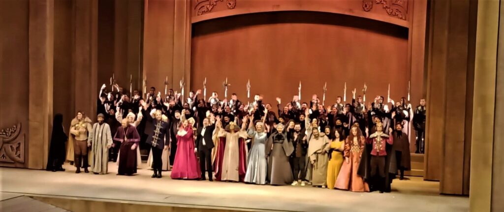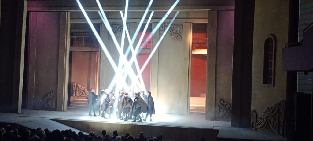 Un aspecto imponente de la obra es la dirección de su movimiento escénico de grandes masas actorales de época, con cuyas acciones el espectador logra esa sensación de que los artistas han trabajado por meses para lograr el impacto que marque el alma durante un par de noches.