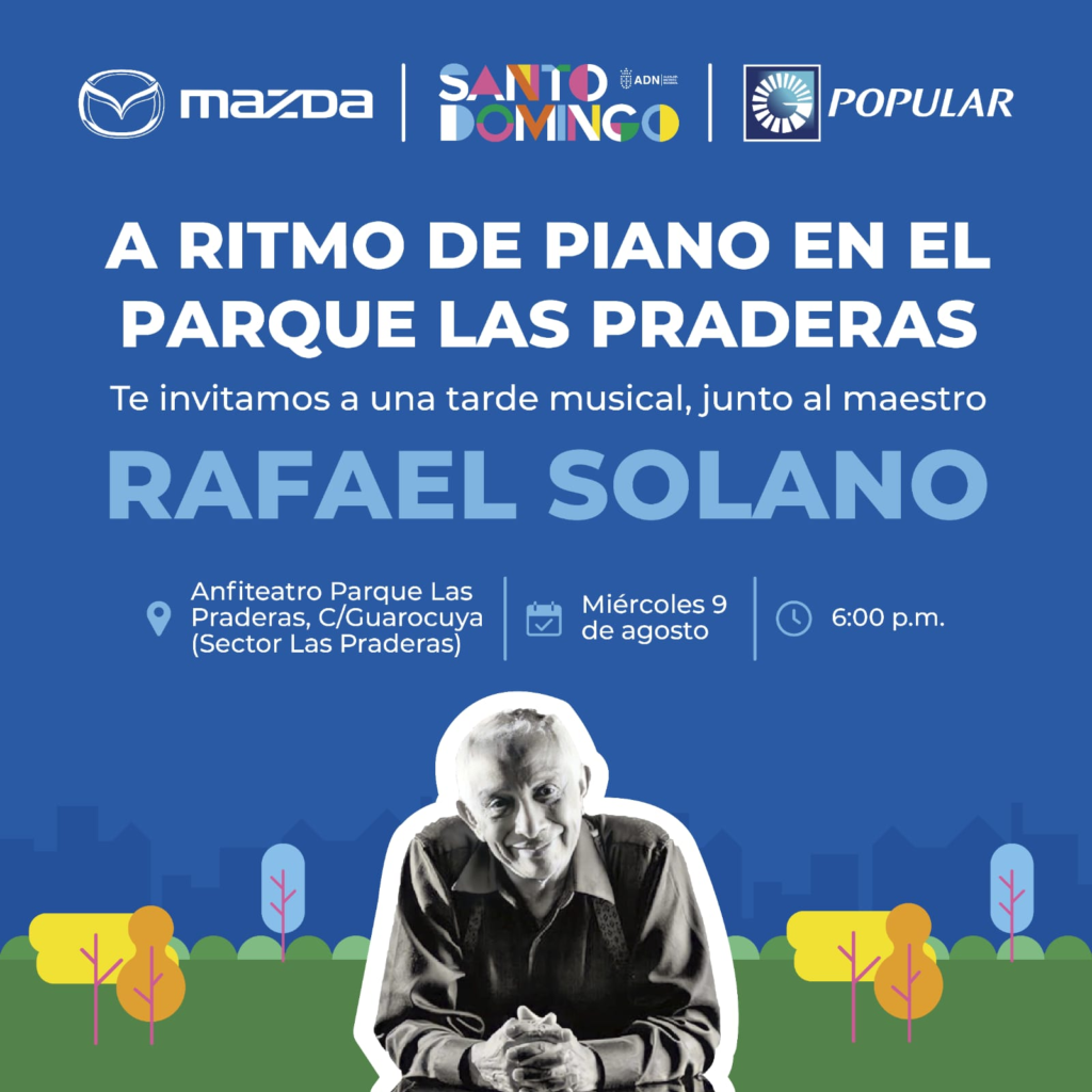 Santo Domingo, RD. Agosto 2023. Con el propósito de continuar creando espacios de diversión y esparcimiento para toda sociedad dominicana llega al Parque de Las Praderas el afamado pianista y compositor dominicano Rafael Solano, con una presentación pautada para este miércoles 9 de agosto a las 6:00 p.m. con el propósito de deleitar a los presentes con sus renombradas canciones.