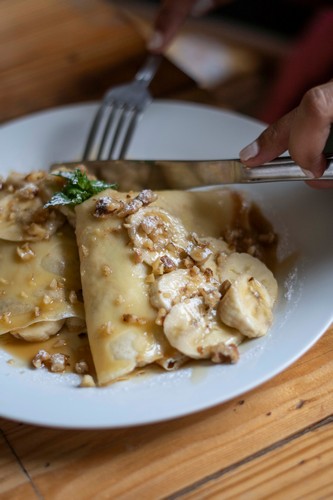 Su menú está compuesto por una amplia variedad de desayunos, desde el clásico dominicano, hasta cuatro tipos de huevos Benedictinos; wafles, pancakes, crepes salados y dulces, pastas, y variedades de cafés, chocolate caliente y deliciosos postres.