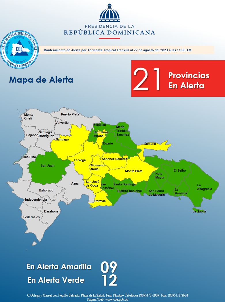 El Centro de Operaciones de Emergencias (COE) emitió alerta a 21 provincias de República Dominicana por posibles crecidas de ríos, arroyos y cañadas, así como inundaciones repentinas o urbanas, debido a que la humedad e inestabilidad asociada a la vaguada y el viento predominante causarán incrementos nubosos más amplios, aguaceros fuertes, tormentas eléctricas y ráfagas de viento.