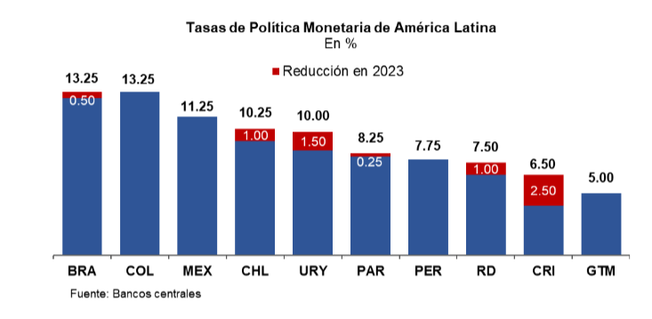 En América Latina (AL), la inflación ha mantenido su tendencia a la baja en los últimos meses y ha retornado al rango meta en gran parte de los países; mientras se proyecta un crecimiento regional de 1.7 % para 2023. En ese contexto, la mayoría de estos bancos centrales ha comenzado a reducir sus tasas de interés de política monetaria en este año, incluyendo a Costa Rica (250 puntos básicos), Uruguay (150), Chile (100), República Dominicana (100), Brasil (50) y Paraguay (25). Adicionalmente, se prevé que otros bancos centrales de la región, como Colombia y México, inicien su ciclo de reducción de tasas antes de finalizar el 2023.