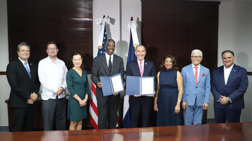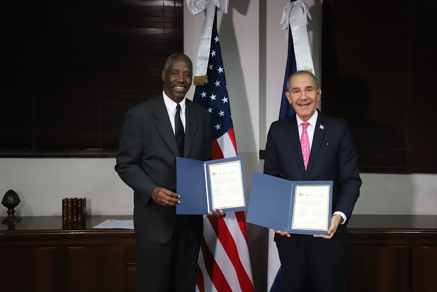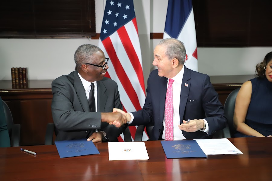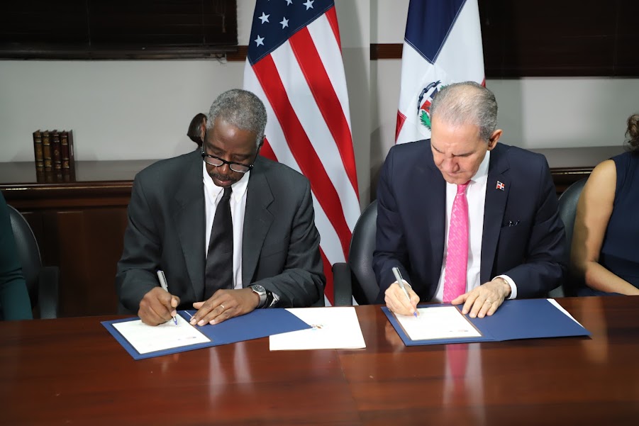 El encargado de Negocios de la Embajada de los Estados Unidos en la República Dominicana, Isiah Parnell, y el ministro de Educación Superior, Ciencia y Tecnología, doctor Franklin García Fermín, tras la firma.