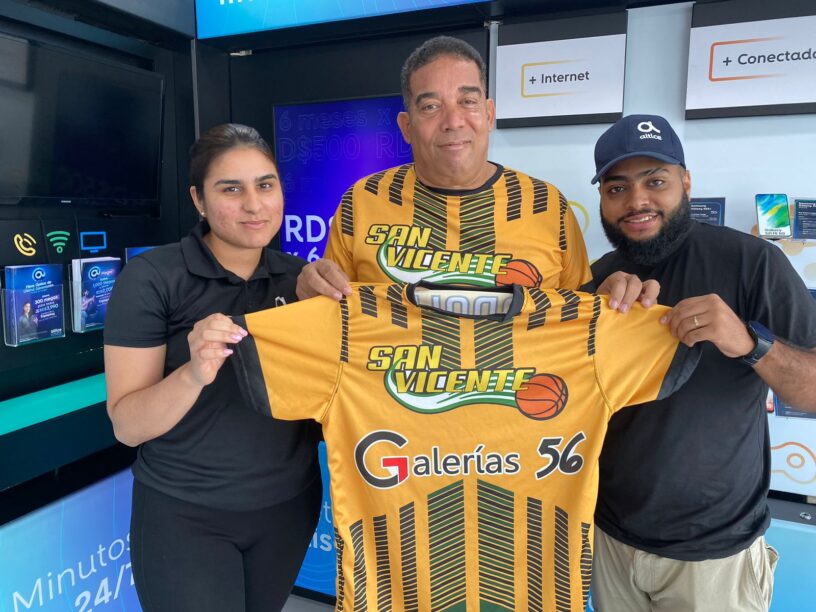 Lisanyi Martínez y Adam Burgos en representación de la empresa Galeria 56 entregan una camiseta al periodista Tony Reyes una de las camisetas que serán utilizada en los juegos.