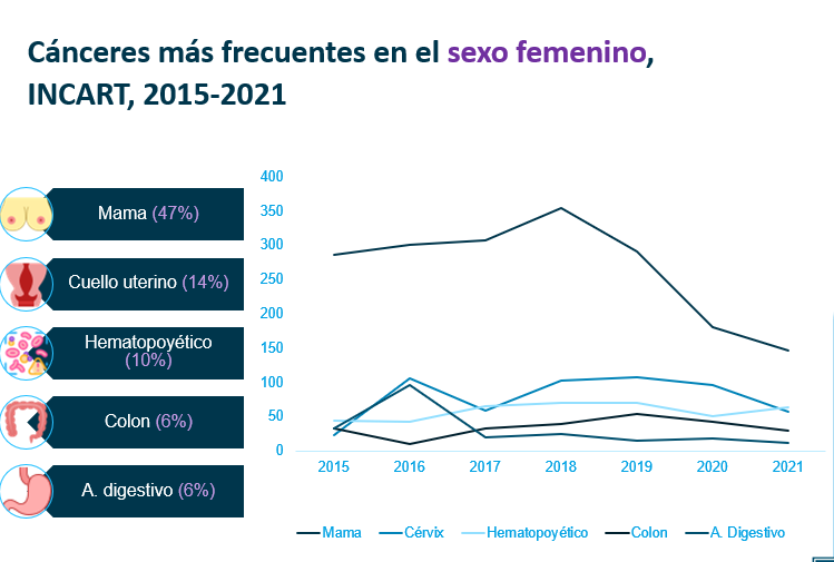 Cuadro que presenta la incidencia de los cánceres más incidentes en mujeres 2015-2021. Dra. Ircania Castillo (Incart).