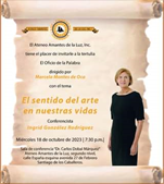 Santiago de los Caballeros.- El Ateneo Amantes de la Luz, Inc. realizará éste miércoles 18 de octubre, la tertulia “El Oficio de la Palabra”, a cargo de la catedrática, gestora cultural y escritora Ingrid González, viuda Rodríguez, con el tema “El Sentido del Arte en Nuestras Vidas”, a partir de las siete de la noche, adonde se han sido citados connotadas figuras de la literatura, educación y filosofía del país.