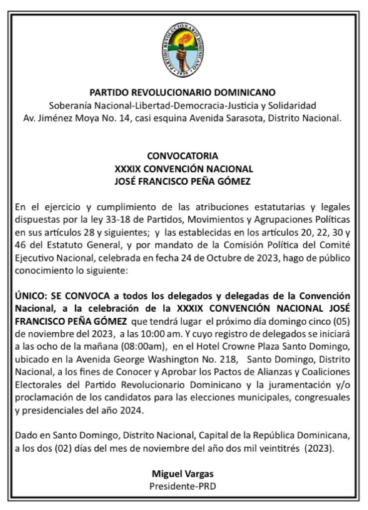 Santo Domingo, RD.– El Partido Revolucionario Dominicano (PRD) llamó a todos los delegados y delegadas a la celebración de la XXXIX Convención Nacional José Francisco Peña Gómez, que tendrá lugar mañana domingo 5 de noviembre, a las 10:00 a. m., para conocer y aprobar los pactos de alianzas y coaliciones electorales de esta organización y la juramentación y/o proclamación de sus candidatos para las elecciones municipales, congresuales y presidenciales del año 2024.