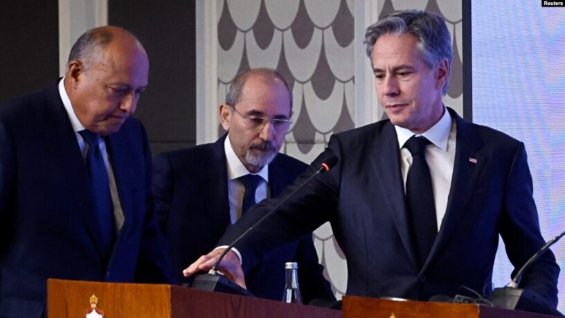El secretario de Estado de EEUU, Antony Blinken, el ministro de Relaciones Exteriores egipcio, Sameh Shoukry, y el viceprimer ministro y ministro de Relaciones Exteriores de Jordania, Ayman Safadi, en una conferencia de prensa, en Ammán, Jordania, el 4 de noviembre. 2023.