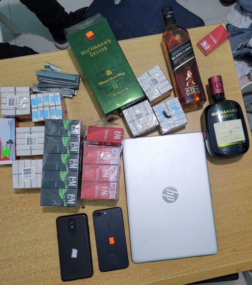 Al momento de la detención, se le ocupó una maleta conteniendo dos litros de whisky, dos celulares, una computadora, varios paquetes de cigarrillos y de fósforos, así como también una mochila con dos perfumes, una pinza, una cizalla, una pata de cabra, tres destornilladores, dos llaves ajustables y un pasamontañas, el mismo al ser entrevistado admitió haber cometido el hecho junto a otro en proceso de identificación.