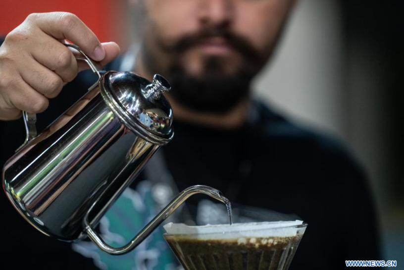 BELO HORIZONTE, 10 noviembre, 2023 (Xinhua) — Imagen del 9 de noviembre de 2023 de un barista preparando café en la SIC (Semana Internacional del Café) 2023, en Belo Horizonte, Brasil. El evento de tres días, con actividades como conferencias, cursos y concursos, atrae a más de 20 mil participantes de más de 40 países y regiones. (Xinhua/Wang Tiancong)