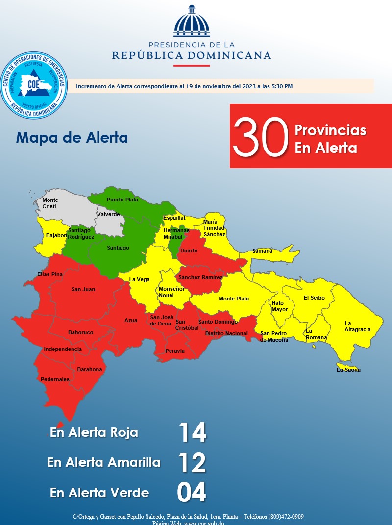 El Centro de Operaciones de Emergencias (COE) informó la tarde del domingo que mantiene a 14 provincias en alerta roja,12 en alerta amarilla y 4 en alerta verde por posible crecida de ríos, arroyos y cañadas debido a que van a continuarán los fuertes aguaceros, tormentas eléctricas y ráfagas de viento asociados al disturbio tropical.