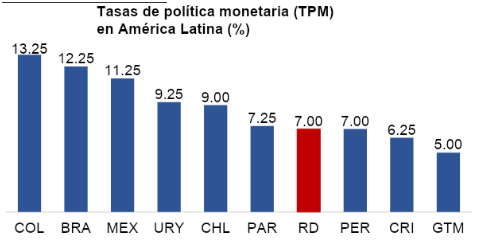 El Banco Central de la República Dominicana (BCRD), en su reunión de política monetaria de noviembre de 2023, decidió reducir su tasa de interés de política monetaria (TPM) en 25 puntos básicos, disminuyendo de 7.25 % a 7.00 % anual. Adicionalmente, la tasa de la facilidad permanente de expansión de liquidez (Repos a 1 día) pasa de 7.75 % a 7.50 % anual; mientras que la tasa de depósitos remunerados (Overnight) se reduce de 6.00 % a 5.50 % anual, ampliando el rango inferior del corredor de tasas de interés del Banco Central. Estas decisiones contribuirán a disminuir los costos de financiamiento de las entidades financieras e incidirán en menores tasas de interés.