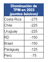En América Latina (AL), la inflación ha mantenido su tendencia a la baja, retornando al rango meta en varios de los países con esquemas de metas de inflación. Como resultado, la mayoría de estos bancos centrales se mantienen reduciendo sus tasas de interés de política monetaria durante los últimos meses, incluyendo a Costa Rica (disminución acumulada de 275 puntos básicos), Chile (225), Uruguay (225), Brasil (150), República Dominicana (150), Paraguay (125) y Perú (75).
