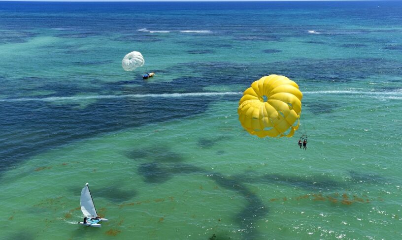 Una vista aérea que muestra personas mientras practican deportes hoy en una playa en Punta Cana (República Dominicana). EFE/Orlando Barría.