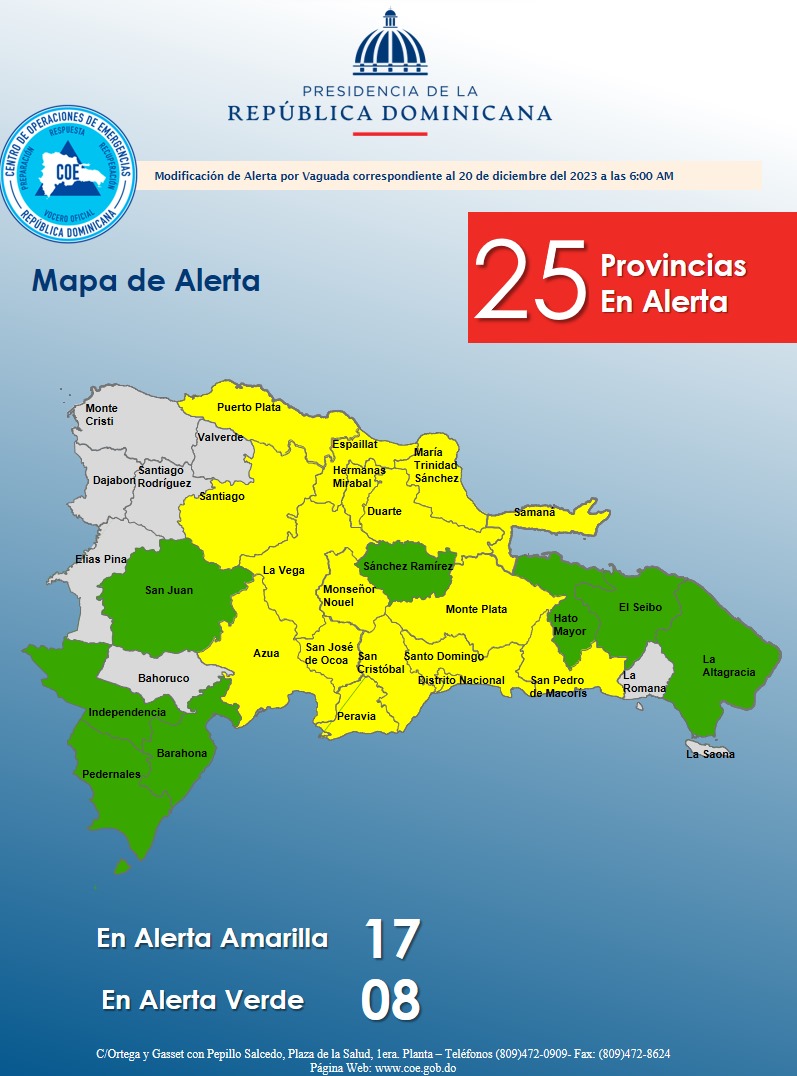 Santo Domingo, RD.- El COE informó el miércoles mantiene 17 provincias en alerta amarilla y 8 en alerta verde, debido a que para este miércoles, se prevé una reducción gradual en la intensidad y frecuencia de las precipitaciones en gran parte del litoral costero caribeño.