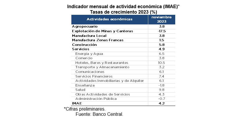 El indicador mensual de actividad económica (IMAE) registró una expansión interanual de 4.2 % en el mes de noviembre de 2023, la tasa mensual más alta del presente año, superior al 3.6 % observado en octubre y al 3.1 % del mes de septiembre de 2023.