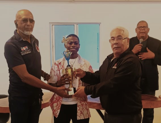 2- Smith Cicerón, es galardonado por Juan Antonio cruz y José Luis Ramírez, presidente de la Federación Dominicana de Karate