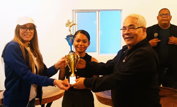 3- Isaura de los Santos, galardonada como atleta revelación del año 2023, la premian, Natachy Tineo ex-seleccion nacional y José Luis Ramírez, presidente de la Federación Dominicana de Karate
