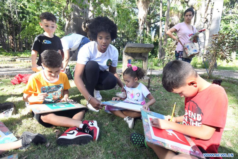 LA HABANA, 14 enero, 2024 (Xinhua) — Imagen del 13 de enero de 2024 de una profesora (i-arriba) impartiendo clases a un grupo de infantes en un taller del proyecto D’artem, en La Quinta de Los Molinos, en La Habana, capital de Cuba. Con sede en la Quinta de Los Molinos, un centenario parque habanero y remanso verde en medio de La Habana, el proyecto D’artem promueve desde la inclusión y el desarrollo de los infantes a través del arte, hasta el contacto con la naturaleza. (Xinhua/Joaquín Hernández)