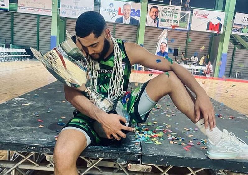 Dayker Cedano, del club Savica, con la copa de campeón, quien fue el Jugador Más Valioso de la serie final del TBS Higüey 2023-24.