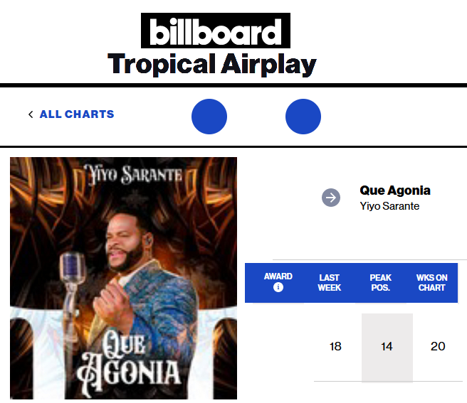 Este éxito de Yiyo no solo es un testimonio del talento y trabajo espectacular de esta superestrella dominicana, sino también un éxito para todo el género de la salsa producida en el país. En la actualidad”Qué Agonía” es la única canción de salseros dominicanos en tan importante lista.