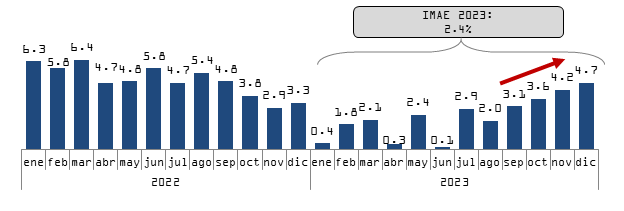 - El indicador mensual de actividad económica (IMAE) registró una expansión interanual de 4.7 % en el mes de diciembre de 2023, siendo esta la tasa mensual más alta del referido año.