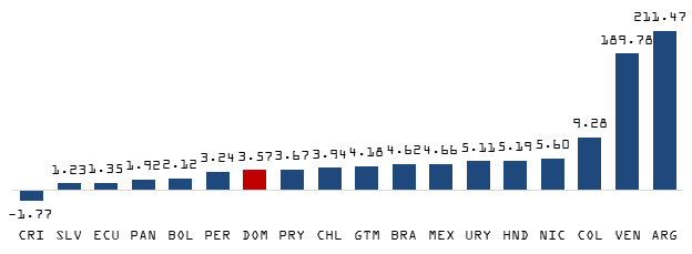 Al analizar los datos de 18 economías de América Latina al cierre del año 2023, se evidencia que la tasa de inflación interanual de la República Dominicana se encuentra entre las más bajas. En efecto, es inferior a la de once países de la región, esto quiere decir que seis de ellos reportan una inflación interanual por debajo de la dominicana, de los cuales tres son de economías dolarizadas (Panamá, Ecuador y El Salvador).