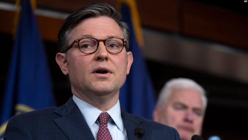 ARCHIVO: El presidente de la Cámara de Representantes de EEUU, el republicano Mike Johnson, habla a los periodistas en el Capitolio de Washington el 30 de enero de 2024.