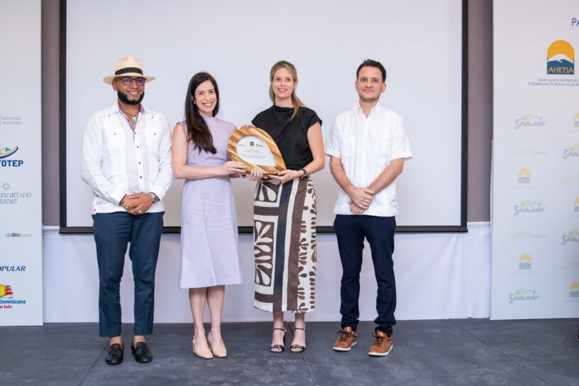 Alejandra y Angela Orsini ejecutivas de Lus y Fuerza de Las Terrenas reciben la placa del Premio Excelencia en Sostenibilidad Turística Empresarial de Samaná.