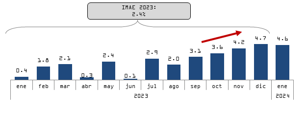 - El indicador mensual de actividad económica (IMAE) registró una expansión interanual de 4.6 % en el mes de enero de 2024.