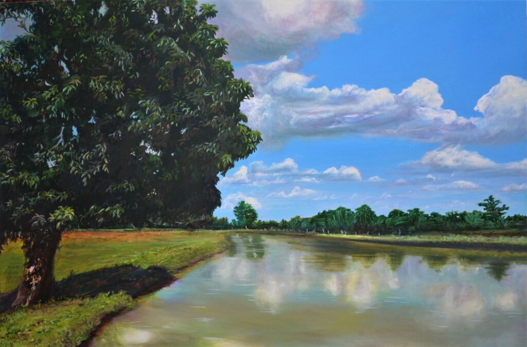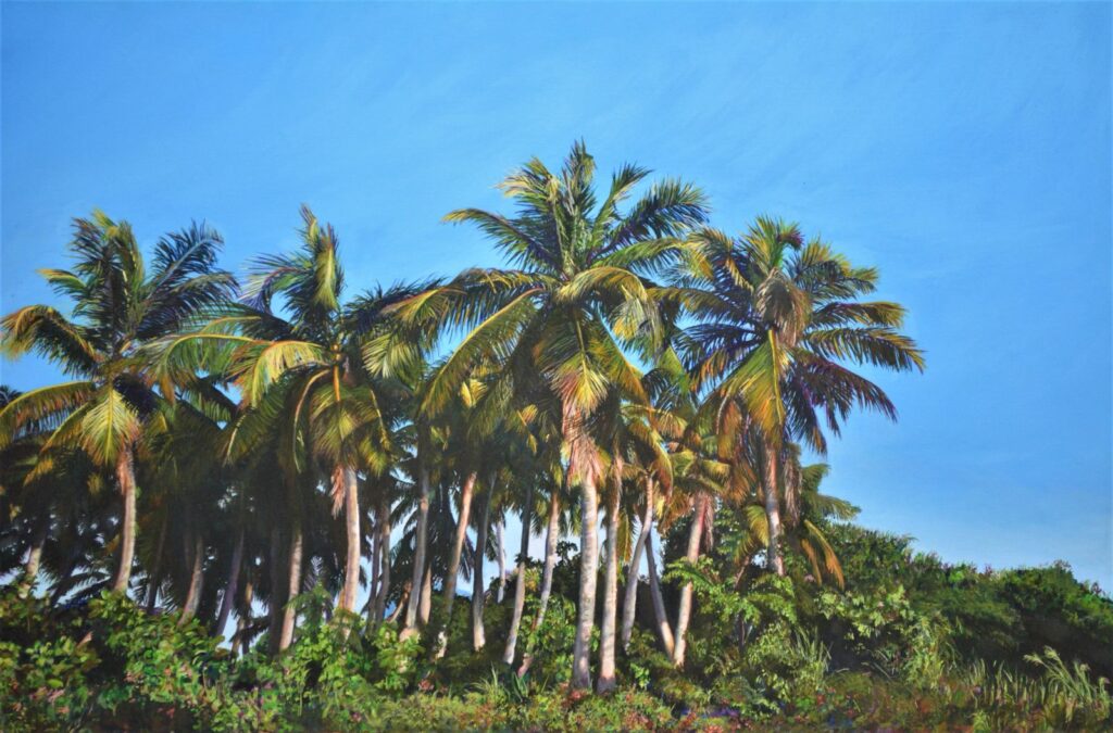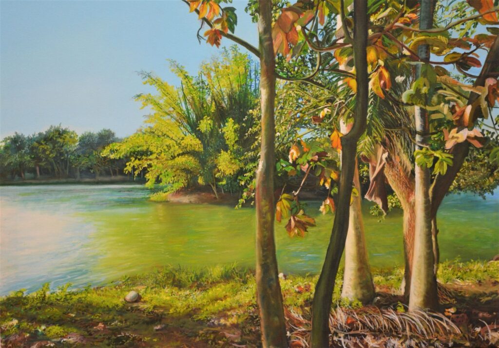 En este contexto, María Oneida con sus pinturas de diversos formatos, nos muestra en sus imágenes el ambiente de nuestros parques citadinos, cocoteros, ríos y lagos del interior de nuestro país.
