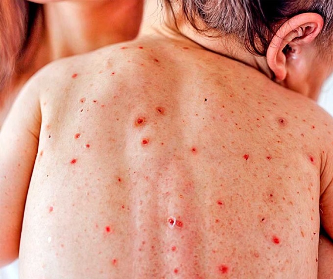 Los primeros síntomas de la enfermedad incluyen fiebre, tos, secreción nasal y ojos rojos y llorosos. De tres a cinco días después de que una persona experimenta los síntomas iniciales, aparece una erupción de manchas rojas en la cara que luego se extiende por todo el cuerpo.
