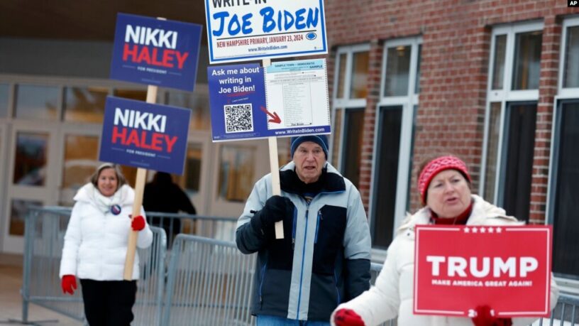 ARCHIVO – Simpatizantes de candidatos frente a un centro de votación en las elecciones primarias del 23 de enero de 2024, en Windham, New Hampshire. El supermartes a la vista con los principales contendientes presidenciales ya pareciendo estar listos.