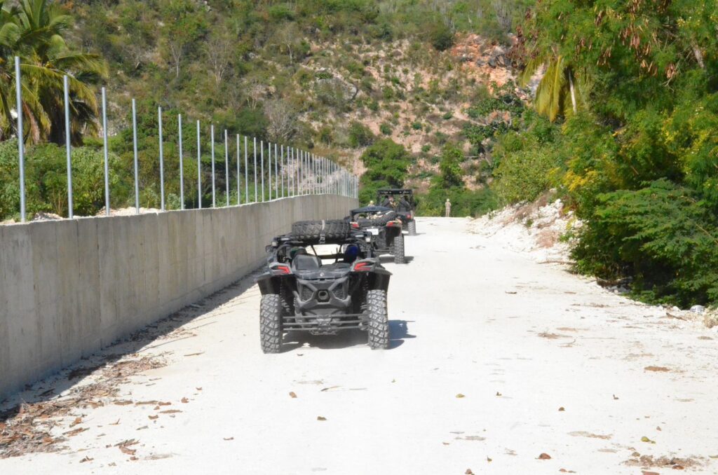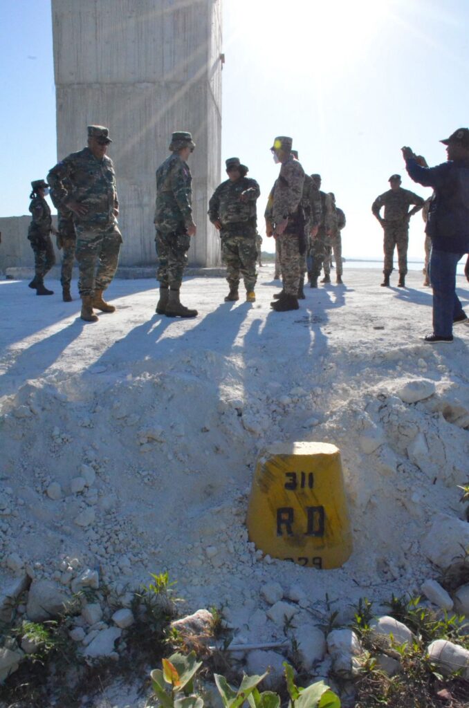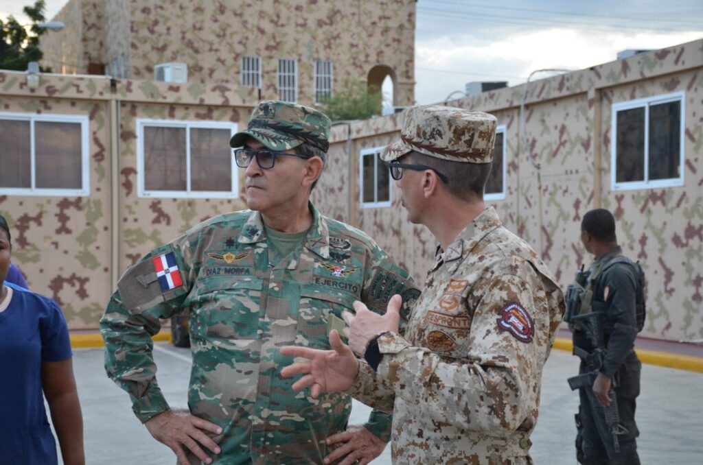 Al ministro le acompañan el director del Centro de Comando, Control, Comunicaciones, Computadoras y Ciberseguridad (C5i), vicealmirante, Luis Rafael Lee Ballester, ARD; el director de Planes y Operaciones del Estado Mayor Conjunto del MIDE, (J3), general de brigada Rafael Antonio Núñez Veloz, ERD, el general de brigada, Freddy R. Soto Thorman, ERD, director del Cuerpo Especializado de Seguridad Fronteriza Terrestre (CESFront) y el supervisor de la verja perimetral general de Brigada Luis A. Coronado Abreu, ERD.