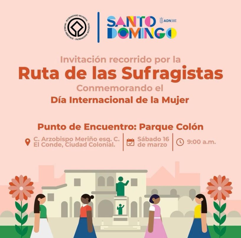 Santo Domingo D.N. – El próximo sábado 16, la Alcaldía del Distrito Nacional invita a la ciudadanía a un recorrido por la “ruta de las sufragistas”, en conmemoración del Día Internacional de la Mujer. Este evento, organizado por la Dirección de Patrimonio Cultural, tiene como objetivo honrar la memoria y las contribuciones de aquellas mujeres pioneras en la lucha por el derecho al voto.