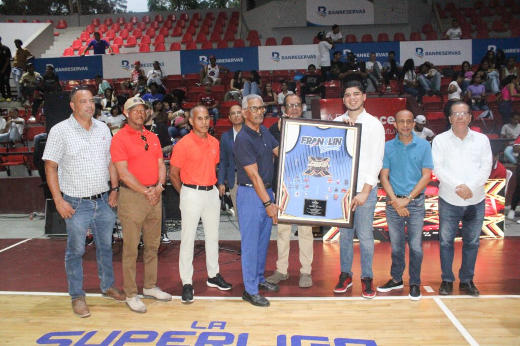 El regidor Víctor Abreu recibe una placa de reconocimiento en representación del senador Franklin Romero en la apertura de la Promo Basket.