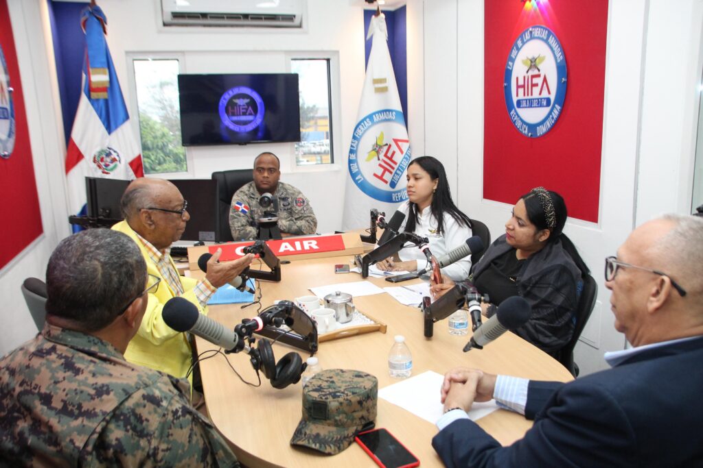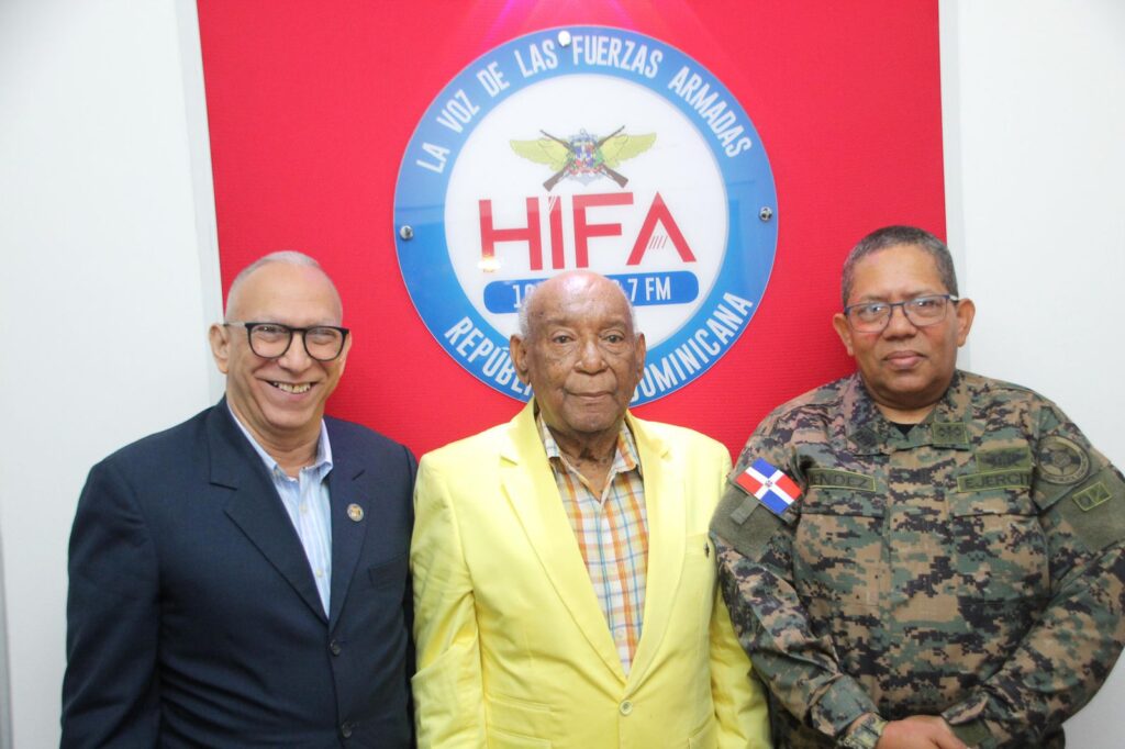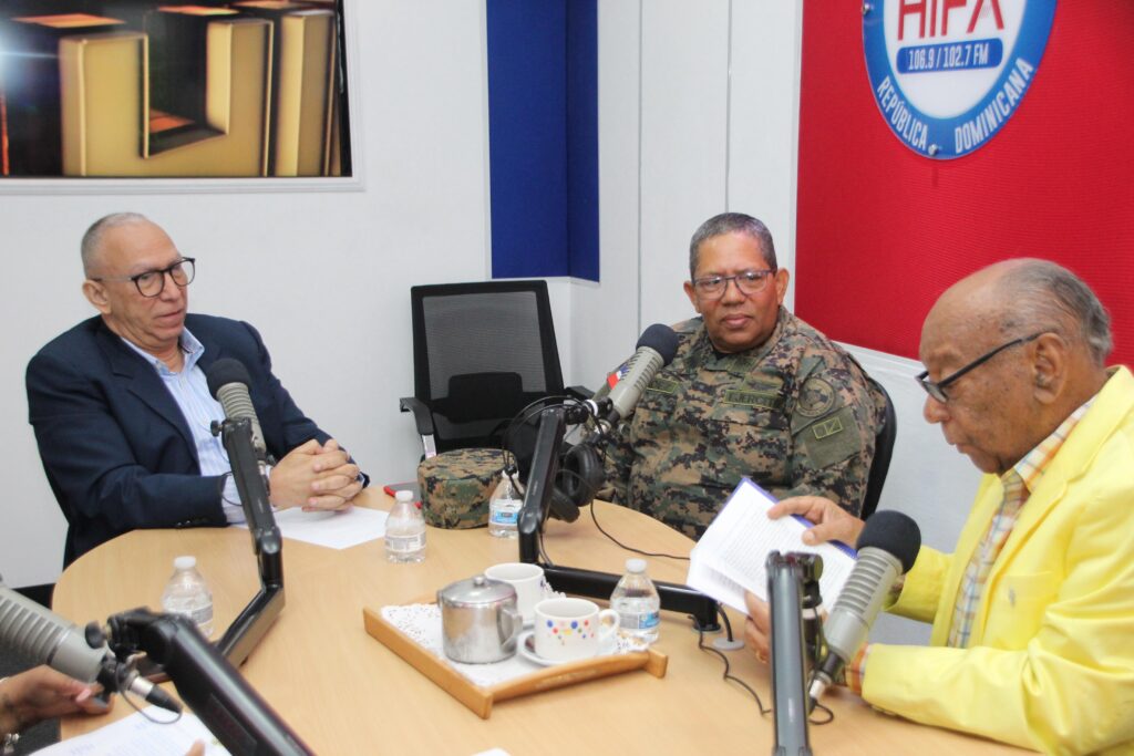 El mayor general (r ) locutor, Osvaldo A. Cepeda Cepeda, FARD, el teniente coronel, Justo Méndez Romero, ERD, y el animador Ross Peña.