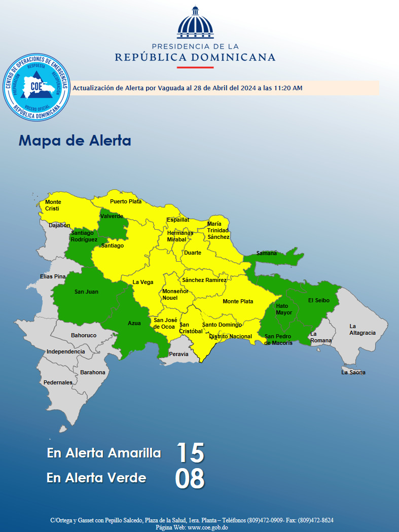 Santo Domingo, RD.- El COE informó el domingo que mantiene 14 provincias y el Distrito Nacional en alerta amarilla. También comunicó que otras 8 provincias están en alerta verde, debido a que tendremos suficiente humedad e inestabilidad proporcionada por la vaguada que afecta el territorio de República Dominicana, por lo que continuarán los aguaceros de moderados a fuertes en varias provincias del país.
