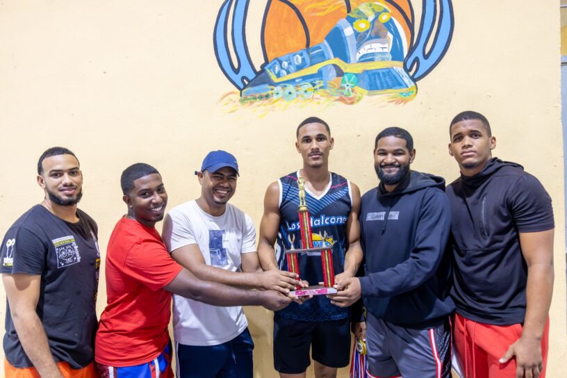Almonte recibió el reconocimiento de MVP de la primera vuelta del torneo de manos de los dirigentes Darwin María presidente de la Comisión Municipal de Baloncesto de Villa Riva, Chelo Contreras, Reimin Guzmán, el comunicador Rolfi Rojas y Freilyn Morel.