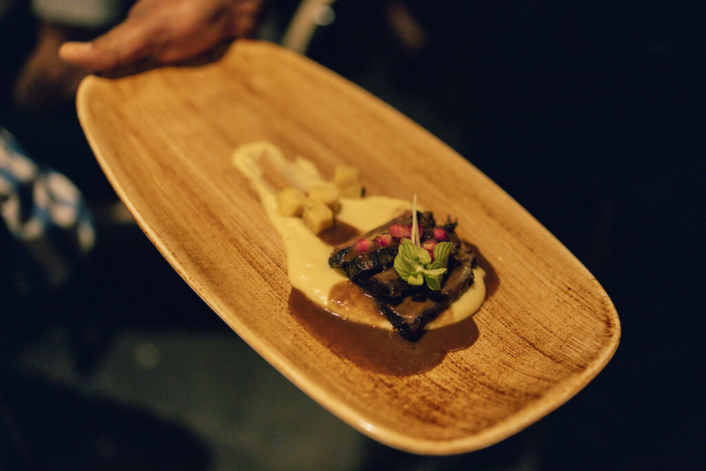 Costillas estofadas Barceló, servidas con puré de plátanos maduros y cebollas crujientes by Chef Alan Vargas.