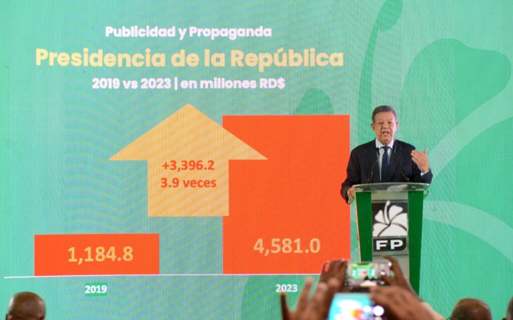 El gasto en publicidad desde febrero 2023 (76, 2) a febrero 2024 (1.013, 4), aumentó 1,229%, indicó Leonel Fernández, sobre la base de los datos que publica el Banco Central.