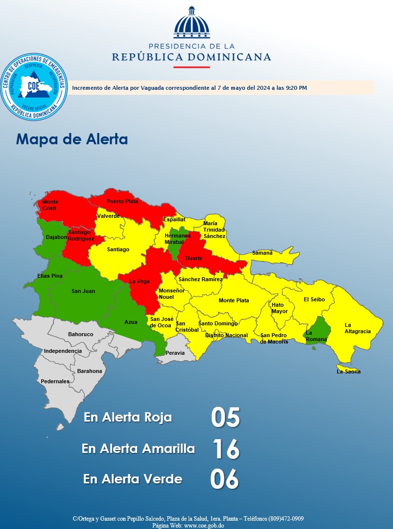 Santo Domingo, RD.- El COE informó la noche del martes que emitió aviso de alerta roja para Duarte ( especial el Bajo Yuna) La Vega, Puerto Plata, Monte Cristi (especial Martín García, Guayabito, El Rincón Manga y todas las zonas de inundación hasta el Cruce de Manga, hacia la descarga del río Guayubín y Castañuela en el Río Yaqué del Norte) Santiago Rodríguez (especial desde la construcción de la Ataguía hasta la zona baja de Montecristi)