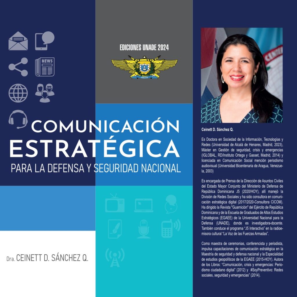 SANTO DOMINGO, RD.-La Universidad Nacional para la Defensa «General Juan Pablo Duarte y Díez» (UNADE) del Ministerio de Defensa (MIDE), editó y presentó el libro “Comunicación Estratégica para la Defensa y Seguridad Nacional”, escrito por la periodista y asimilada militar Ceinett Sánchez Quintero.