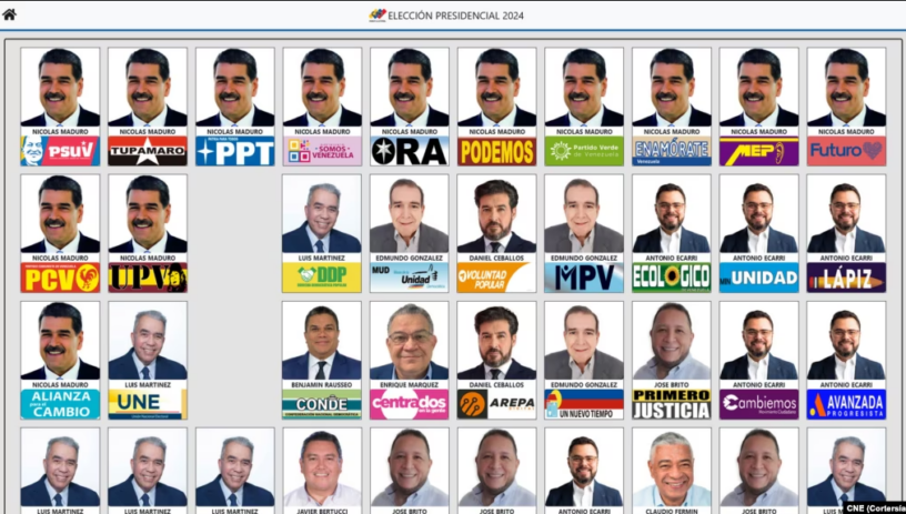 Los rostros de los 10 candidatos que participan en la elección aparecen en la boleta “tantas veces como organizaciones lo presenten”, conforme establece el sistema electoral venezolano, explica a VOA el politólogo y consultor electoral, Jesús Castellanos.
