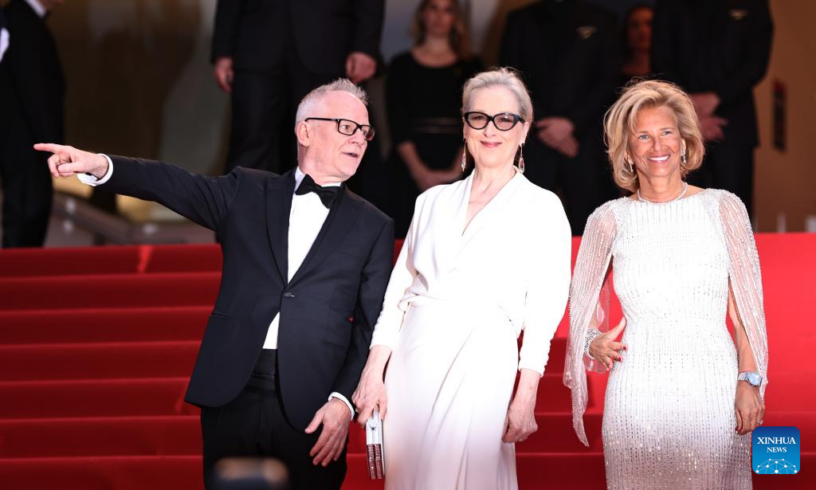 CANNES, 15 mayo, 2024 (Xinhua) — Imagen del 14 de mayo de 2024 de la actriz estadounidense, Meryl Streep (c), la presidenta del Festival de Cine de Cannes, Iris Knobloch (d), y el delegado general Thierry Fremaux, vistos en la alfombra roja de la ceremonia de inauguración durante la 77 edición del Festival de Cine de Cannes, en Cannes, en el sur de Francia. La 77 edición del Festival de Cine de Cannes se inauguró el martes en la Riviera francesa, con una selección de 22 películas que compiten por la codiciada Palma de Oro. La competencia cinematográfica de este año incluye películas como «Kinds of Kindness» del director griego Yorgos Lanthimos y el drama épico de ciencia ficción «Megapolis» del doble ganador de la Palma de Oro, Francis Ford Coppola. Cineastas asiáticos como Jia Zhang-Ke de China con su «Feng Liu Yi Dai (Caught by the Tides)» y Payal Kapadia de India con su «All We Imagine as Light» también brillan en la categoría de premios principales. (Xinhua/Gao Jing)